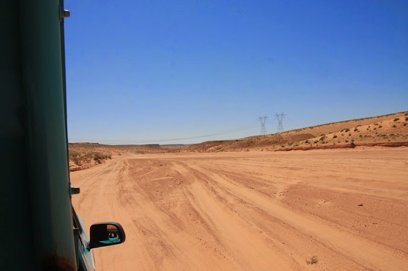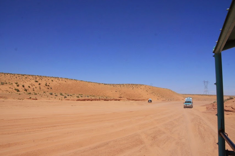 Then we pile into the trucks, 12 to each one, and head out for the 20 minute ride to the mouth of the slot canyon. Part of the ride is on the highway but about 1/2 is down a very sandy, bumpy wash.